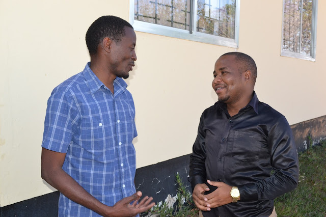 Afisa TEHAMA, Ofisi ya Mkuu wa Mkoa Singida Bw. Baraka Mhembano (kulia) akiwa na Afisa TEHAMA wa Halmashauri ya wilaya ya Manyoni Bw. Abas Said wakizungumza jambo baada ya kutoka kwenye mafunzo.